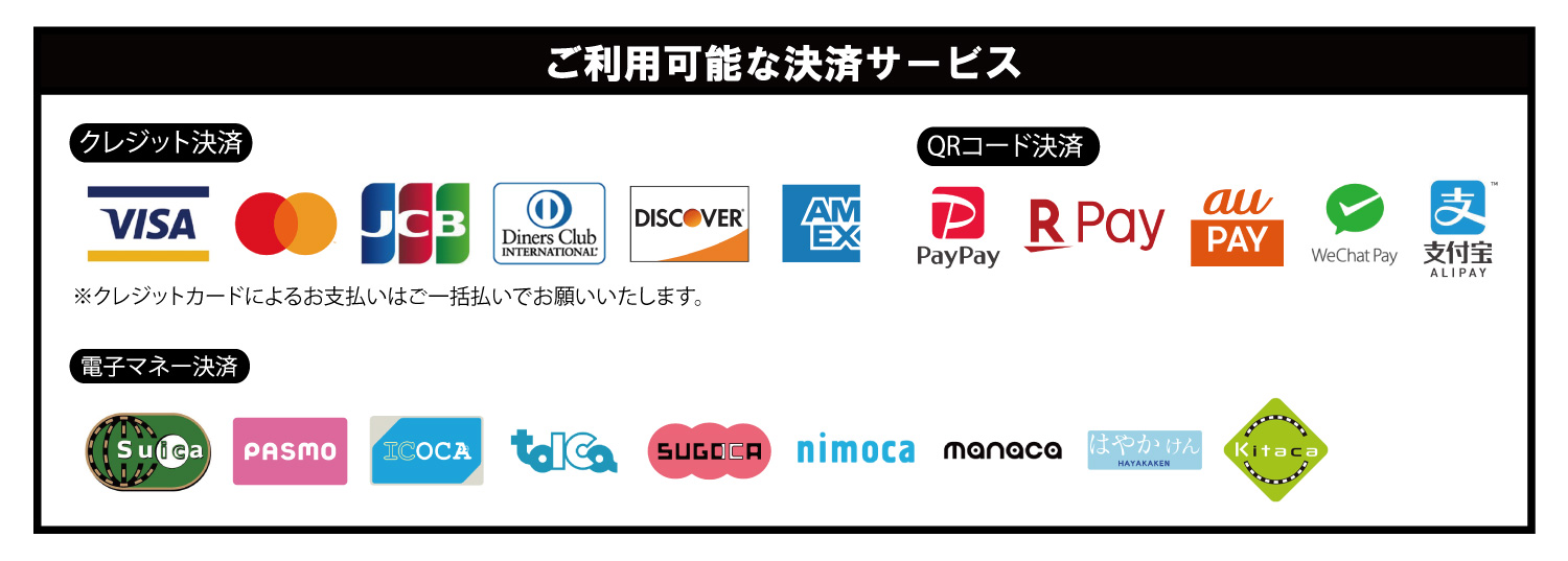 ・現金、クレジットカード、QRコード決済、電子マネー決済(交通系)がご利用いただけます。レジにてお申し付けください。
